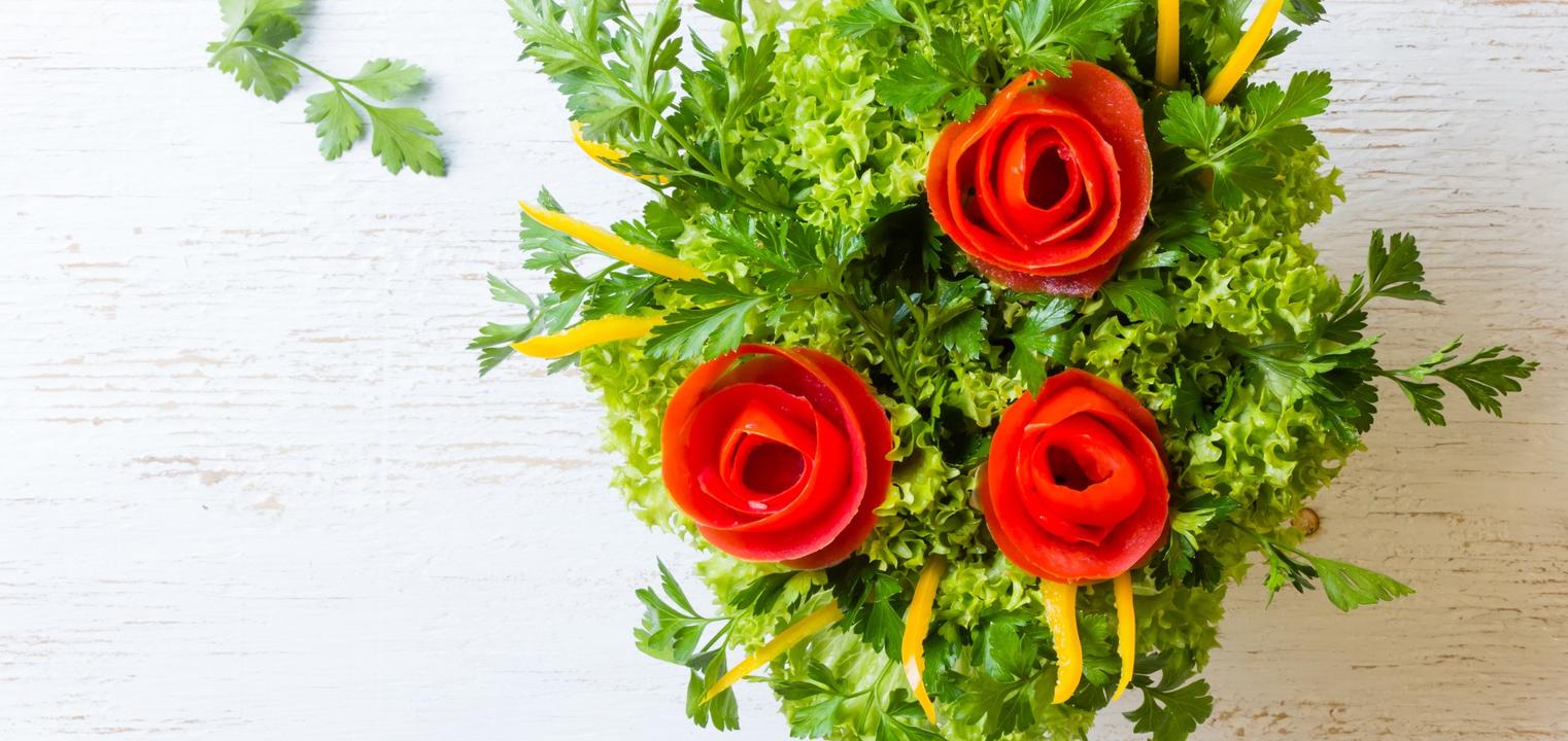 Z miąższu pomidora, odpowiednio obranego, możemy wykonać śliczne dekoracyjne różyczki. Obierki z pomidora okręcamy luźno wokół palca, puszczamy luźno i gotowe. Podobnie „skonstruowane” różyczki można zrobić również ze skórki ogórka, z surowej (lub gotowanej) marchewki i rzodkiewki. W taki sposób powstanie bukiet różnokolorowych kwiatów, pięknie dekorujący półmisek. Do robienia różyczek nadają się też plastry wędlin i żółtego sera, tylko trzeba je umiejętnie zwinąć. Kwiatowa dekoracja – w zależności od tego, z czego będzie wykonana, może ozdobić każdą sałatkę.