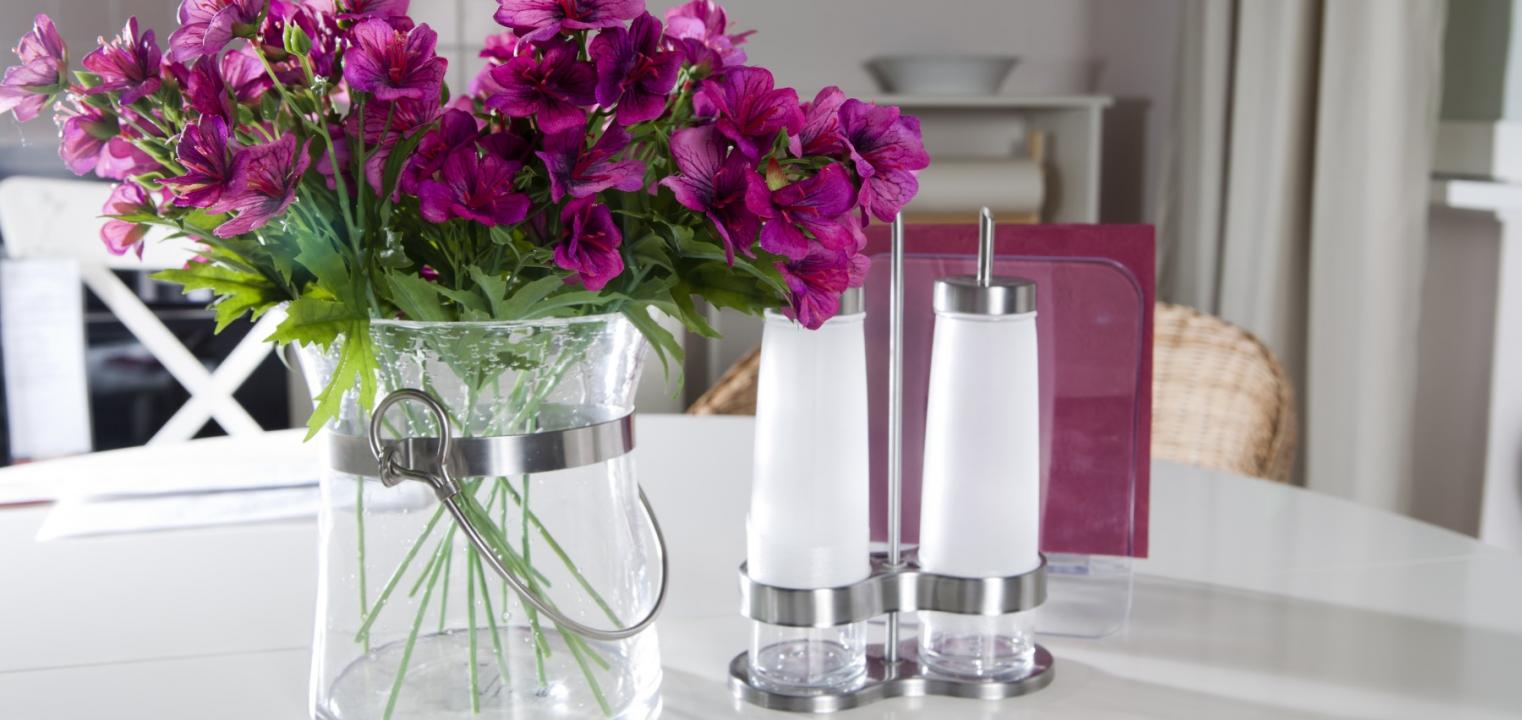 Fiolet można przemycić do kuchni również w formie gąbek do mycia naczyń (i fioletowego płynu w przezroczystym pojemniku z dozownikiem), ściereczek, rękawic do chwytania garnków lub kompletu sztućców z fioletowymi trzonkami. Świetny pomysł to jeden, ale mocny fioletowy akcent: elektryczny lub tradycyjny czajnik, lakierowany na wysoki, fioletowy połysk kosz na śmieci czy też kosz z wrzosem na kuchennym parapecie.