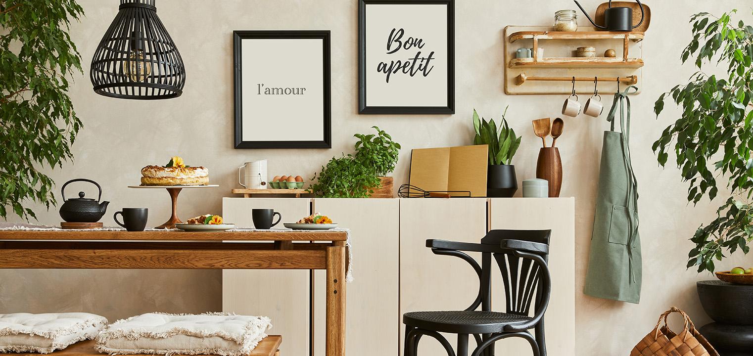 Drewniane dodatki, takie jak deski do krojenia, półki, czy drewniane rameczki na zdjęcia, nadają kuchni naturalnego uroku i ciepła.