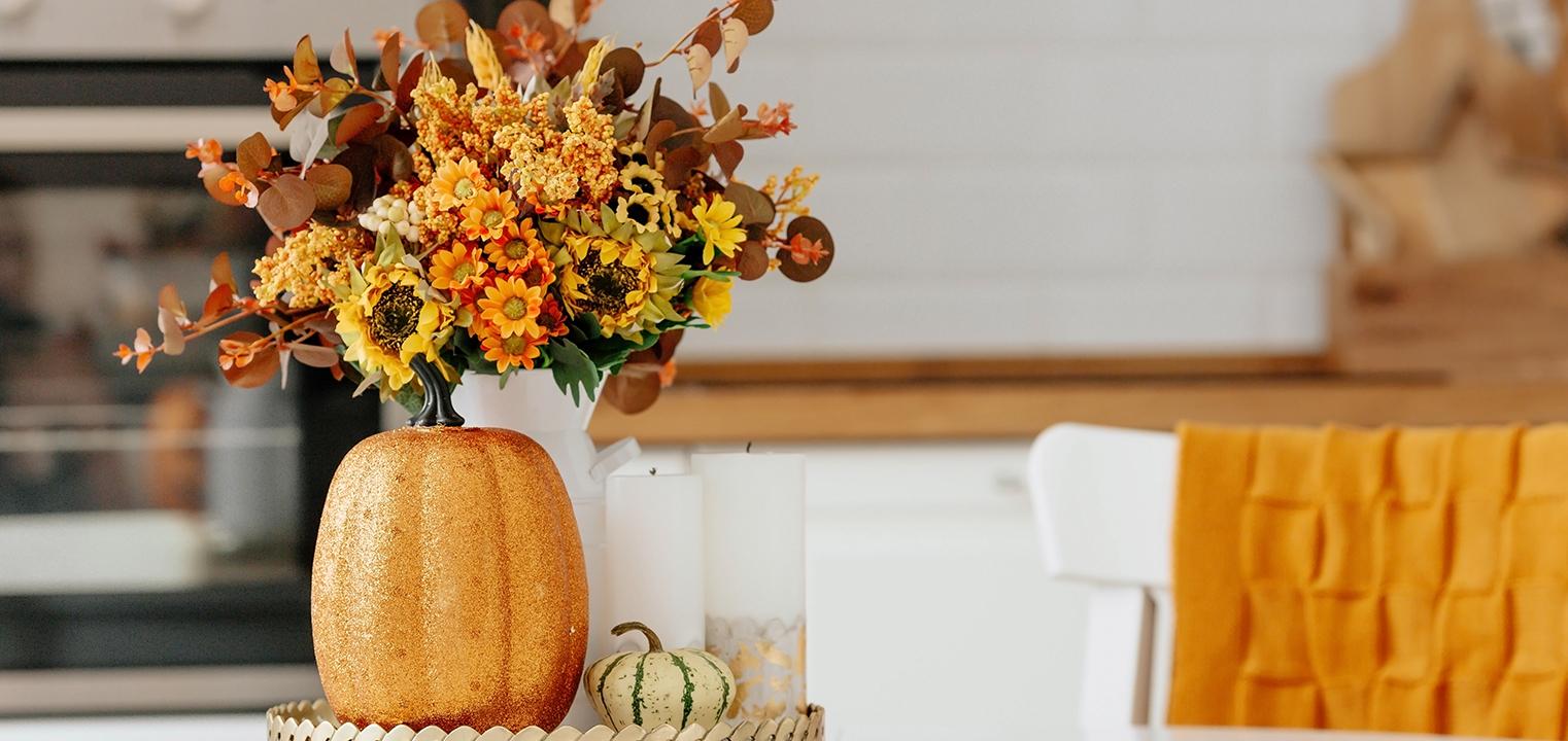 Zestawy wazonów w jesiennych kolorach i świeczek o aromatycznych zapachach to doskonały sposób na udekorowanie kuchennego stołu. Kwiaty w ciepłych odcieniach lub gałązki ozdobione jesiennymi liśćmi nadadzą Twojej kuchni eleganckiego wyglądu.