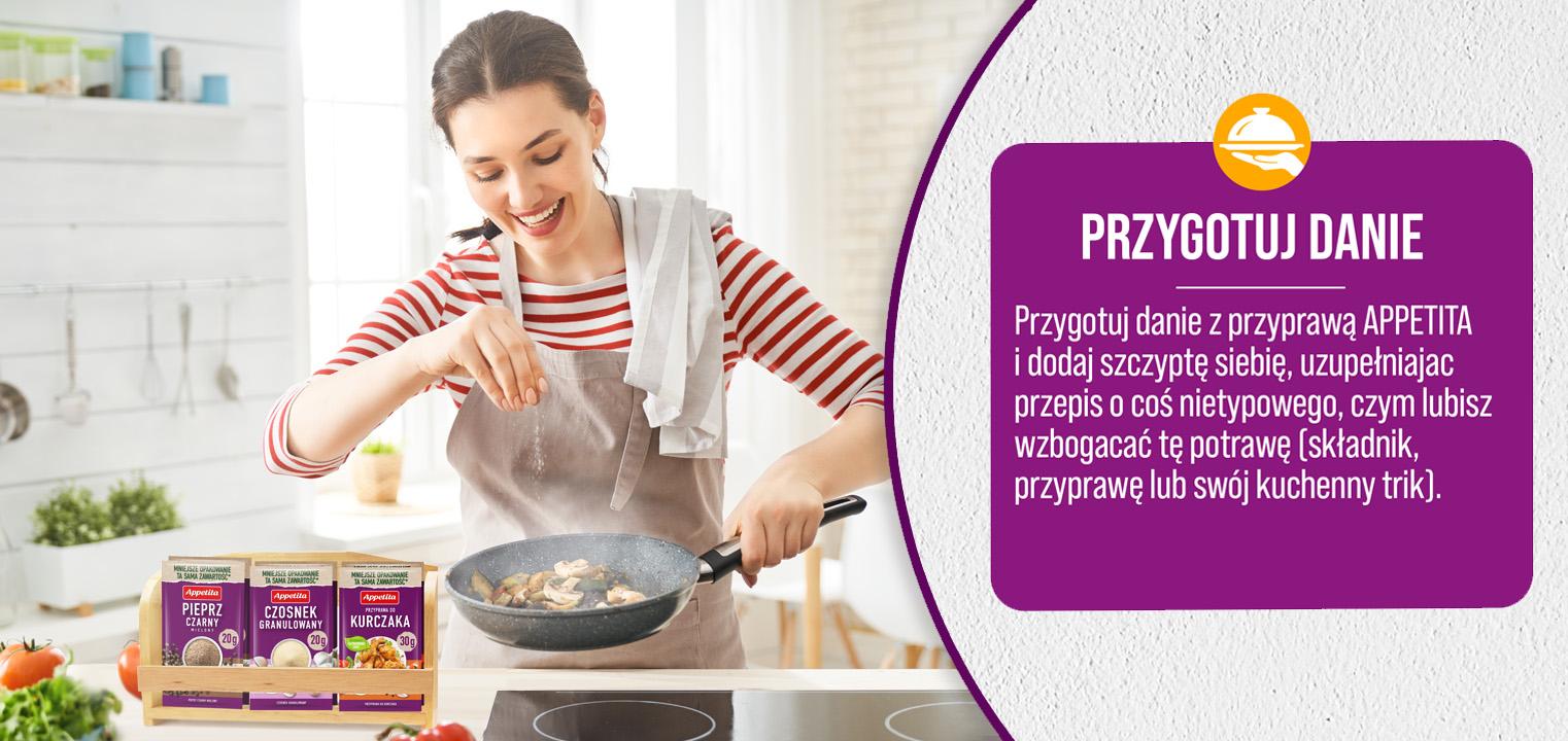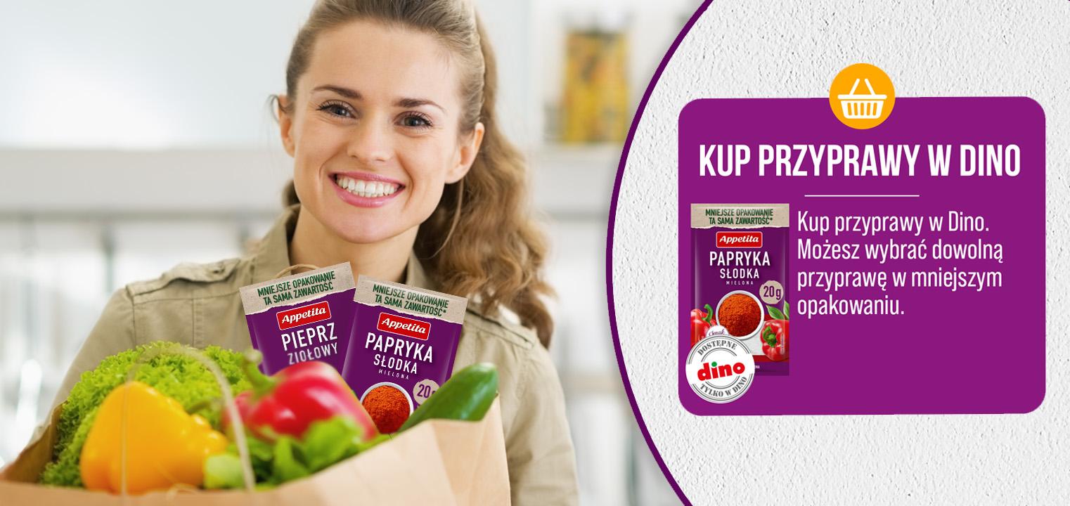 1. Podczas gotowania koniecznie użyj wybranej przyprawy Appetita w mniejszym opakowaniu, zakupionej w markecie DINO.