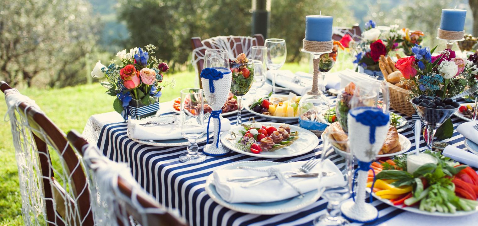 Słońce, fale i morski piasek… Przyjęcie w morskim stylu to idealny przedsmak zbliżających się wakacji. W dekoracji stołu będą dominowały kolory błękitny oraz biały. Wykorzystaj obrus, bieżniki i zastawę właśnie w tych barwach. Jeżeli nie posiadasz dodatków w tych kolorach, a nie chcesz inwestować w ich zakup, zaopatrz się w jednorazowe serwetki, kubki i talerzyki. Już za kilka złotych można je nabyć w pięknych, marynistycznych wzorach. Użycie jednorazowej zastawy to także duża oszczędność czasu podczas sprzątania po przyjęciu. Styl morski lubi naturalne sznurki przypominające cumy i liny znajdujące się na statku. Możesz nimi obwiązać szklanki, w które włożysz podgrzewacze i świece, przyjemnie umilające atmosferę, gdy słońce schowa się za horyzontem.