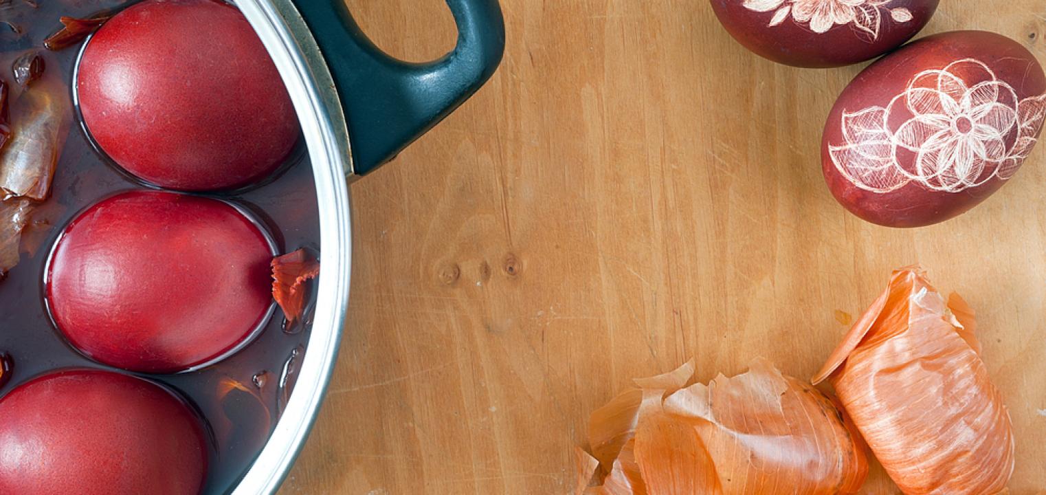 Łuski cebuli to najpopularniejszy sposób na szybkie i proste zabarwienie jajek. Otrzymany kolor nie jest może imponujący, ale wygląda naturalnie i będzie świetną bazą do dalszego dekorowania. Do przygotowania barwnika wykorzystujemy żółte albo czerwone łuski. Układamy je w garnku, zalewamy wodą i gotujemy 10-15 minut. Następnie wkładamy jajka lub wydmuszki, przykrywamy kolejną warstwą łusek, gotujemy kolejne 5 minut i zostawiamy w wywarze do całkowitego wystudzenia.
