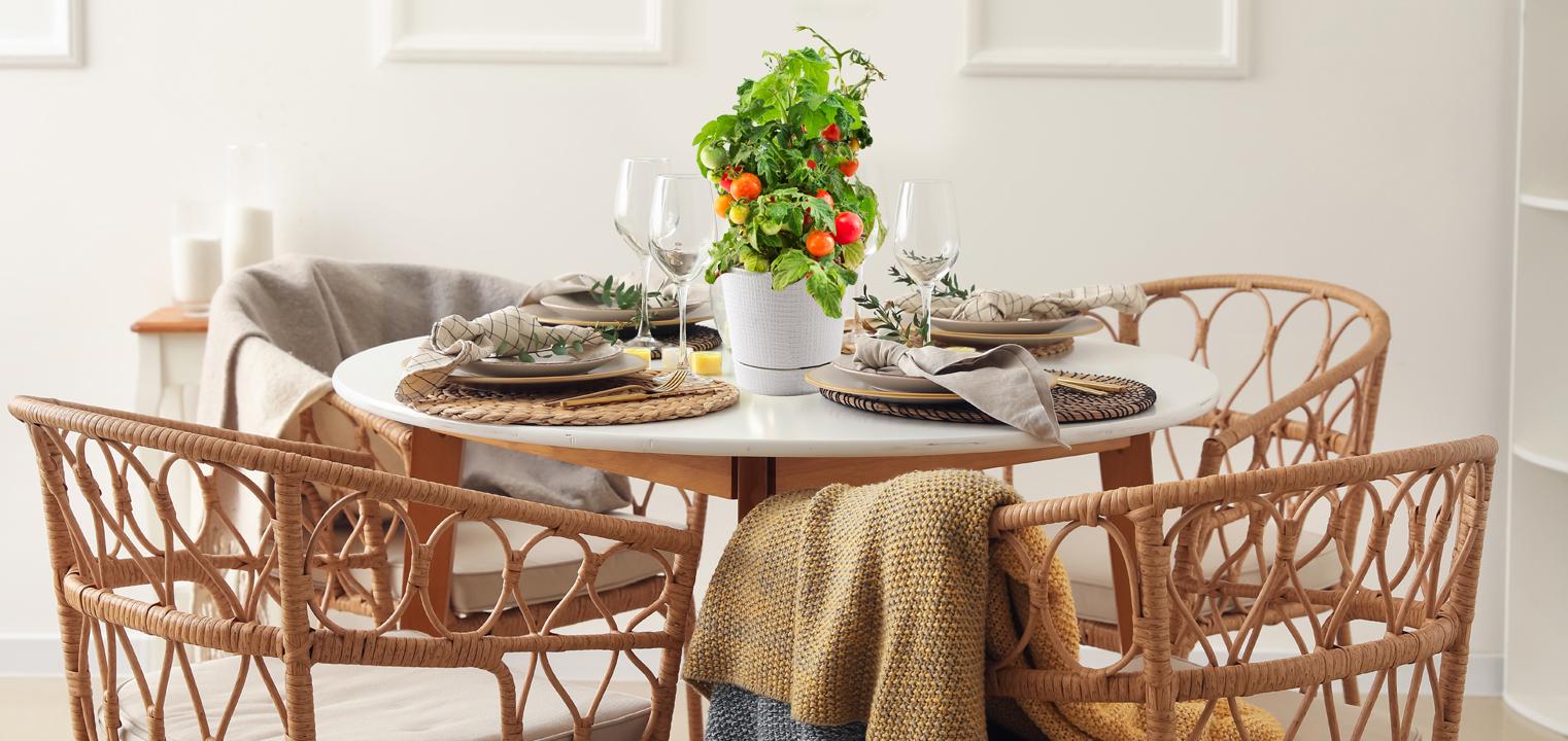 Podczas planowania letniego stołu z pomidorami, zacznij od inspiracji ich naturalną kolorystyką. Czerwień, róż, żółć, głęboka zieleń – to paleta, która nadaje ton całej stylizacji. Wprowadź ją w naczyniach, serwetach i dekoracjach. Naturalne tkaniny – len, bawełna, surowe płótno – podkreślą letni, swobodny charakter. Najlepiej sprawdzą się w odcieniach piasku, kości słoniowej lub bardzo bladej szarości. Stół powinien wyglądać lekko i „oddychać” – nie zasłaniaj go ciężkimi materiałami ani nie obciążaj nadmiarem dekoracji. Zostaw wolne fragmenty blatu, by naturalne światło mogło pracować z powierzchnią. To właśnie ten oddech między przedmiotami czyni stylizację elegancką i spójną. A zamiast kwiatów, na środku stołu umieść małe drzewko pomidorków koktajlowych.