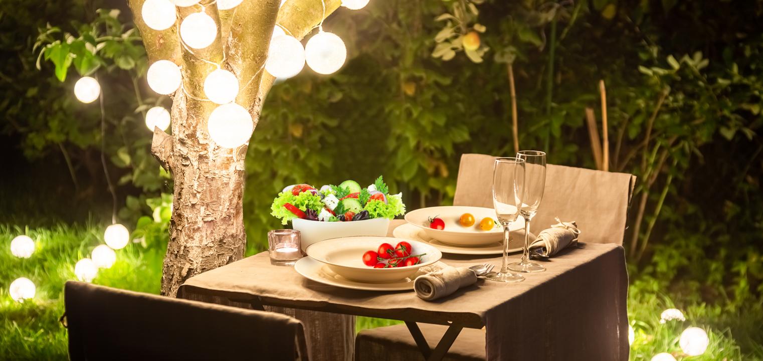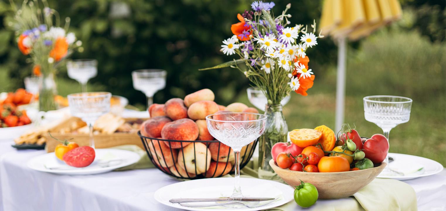 Stylizacja stołu to nie tylko to, co na blacie, ale też to, co wokół niego. Jeśli spotkanie odbywa się wieczorem, światło jest kluczowe – wybierz girlandy świetlne, latarenki, świece w szklanych słoikach. W dzień zadbaj o cień – delikatny baldachim z przewiewnej tkaniny, parasol albo lekka konstrukcja z rośliną pnącą mogą stworzyć przyjemny mikroklimat. Stół ustaw w miejscu, które tworzy naturalną scenografię – pod drzewem, przy ogrodowej rabacie, blisko otwartego okna lub pod pergolą. To, co w tle, ma znaczenie – nawet najpiękniejszy stół potrzebuje kontekstu, by naprawdę wybrzmieć. Dobrze, jeśli ma przestrzeń wokół siebie – nie przytłaczaj go zbędnymi meblami czy dodatkami.