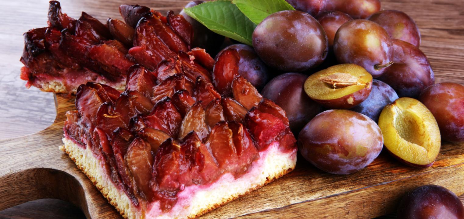 Ciasto ze śliwkami pięknie zaprezentuje się na grubej drewnianej desce.