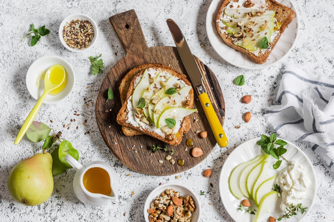 Grzanki z miodowym twarożkiem i gruszką