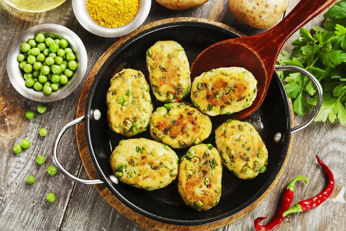 Ziemniaczane kotleciki z curry i groszkiem z pieca