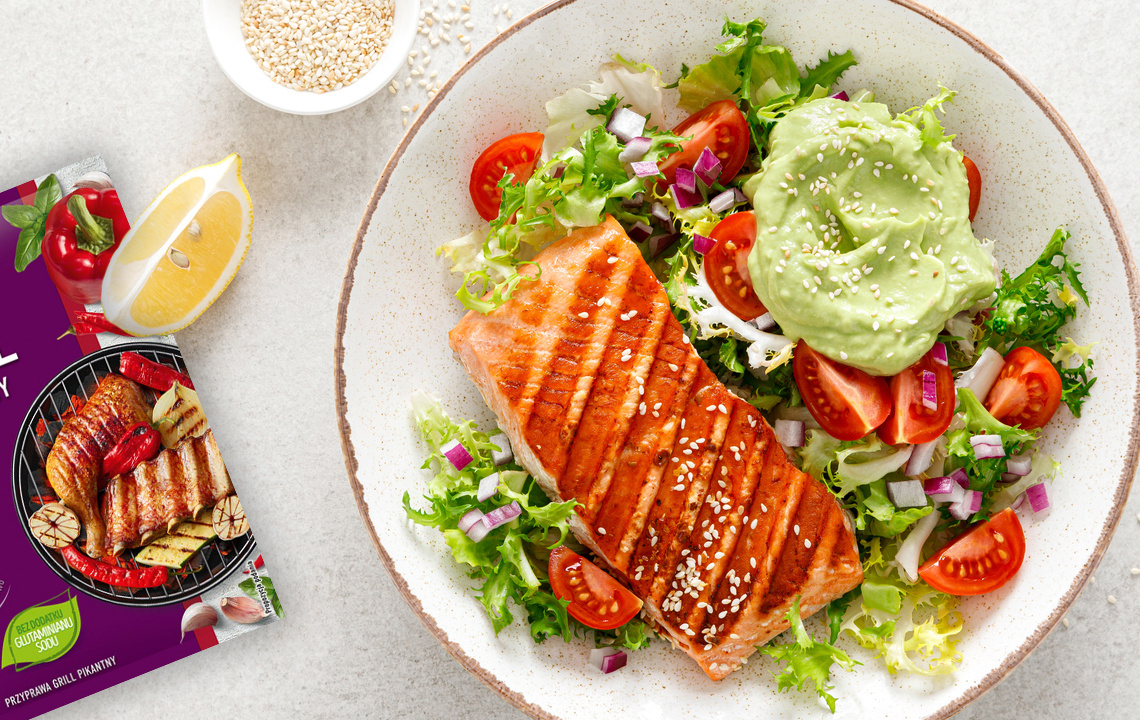 Grillowany łosoś z sałatką i kremowym dipem z awokado