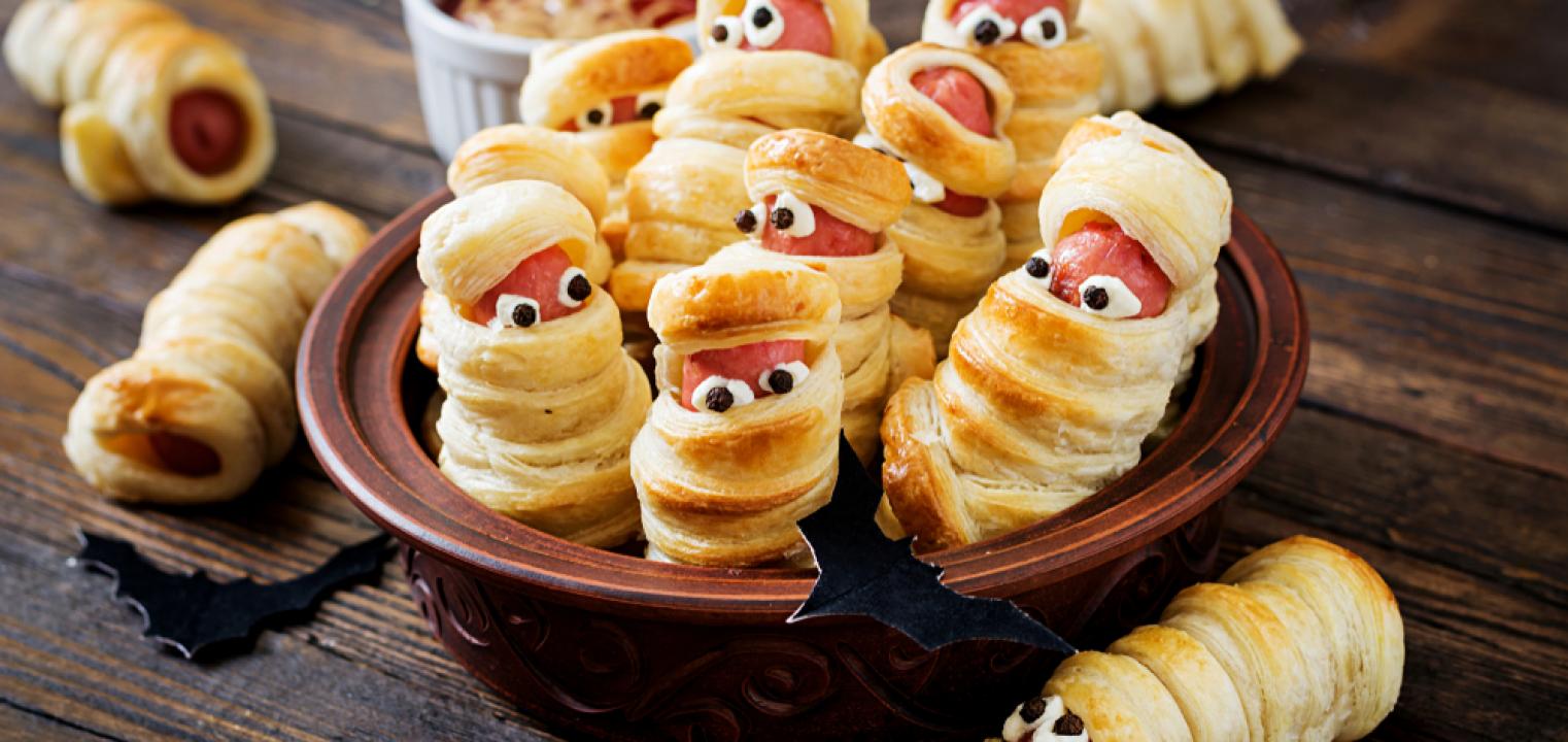 Przyjęcie to nie tylko słodycze, ale także przekąski. Na ich przygotowanie też warto poświęcić czas, by wpasowały się w stylistykę imprezy. Flagowym daniem na halloweenowym stole powinny być kiełbaski lub parówki mumie. Do ich przygotowania wystarczy otoczyć mięso cienkimi paskami ciasta, a następnie upiec całość. Po wyciągnięciu z piekarnika dorysowuje się im oczka z musztardy. Mumie są gotowe, by ruszyć na kulinarną ucztę.