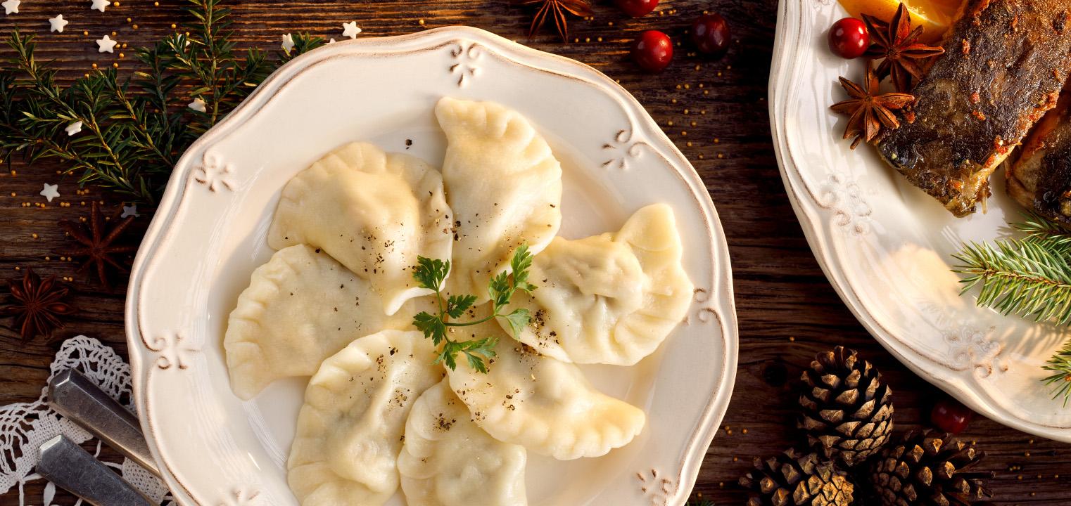 Bez pierogów wigilii po prostu sobie nie wyobrażamy! Aby ładnie prezentowały się na talerzu ułóżmy je w okrąg, lub półokrąg, a na środku podajmy sos w słoiczku. Symetria to sprzymierzeniec każdej efektywnej stylizacji dania, a taki na wpół pusty talerz będzie wyglądał bardzo elegancko, przez swój minimalizm. Jeśli podajemy pierogi z grzybami, uczyńmy z grzybków małych bohaterów, dokładając je osobno na tym samym talerzu, w słoiczku lub miseczce, by ładnie się komponowały, zdradzając, co jest w środku naszych pierogów. Do wystylizowania pierogów z kapustą warto użyć ziarenek gorczycy i pieprzu, które ładnie ozdobią nasze danie.