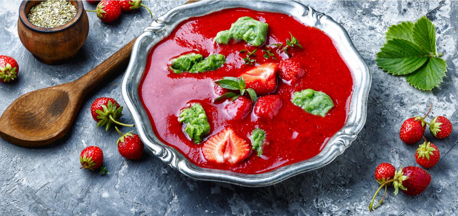 Chłodnik z truskawek prezentuje się naprawdę smacznie! Wyobraźcie sobie zachwyt gości w upalny dzień, gdy podacie im orzeźwiający chłodnik o bardzo energetycznym, czerwonym kolorze. Ozdóbcie go owocami kiwi, borówkami i koniecznie liśćmi świeżej mięty. Pięknie będzie wyglądał podany w miseczce z kokosa albo ceramicznej w stylu azjatyckim, z niebieskimi zdobieniami. Podobnie estetycznie będzie prezentować się truskawkowe smoothie w wysokich szklankach z palemką. A jak ozdobić taką szklankę? Wysypcie na deskę brązowy cukier i zanurzcie w nim wilgotną szklankę, stawiając ją do góry nogami na cukrze – wówczas cukier osiądzie na obrzeżach szklanki. Górę smoothie posypcie wiórkami kokosowymi.