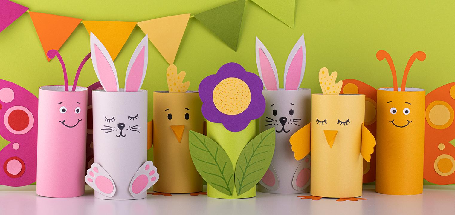 Przygotuj zużyte rolki po papierze toaletowym, kolorowy papier, farby, plastelinę i sznurek. Dzieci mogą pokolorować roleczki, uformować z nich zajączki: dodać uszka z papieru, oczy z plasteliny i wąsy ze sznurka. To prosty sposób na stworzenie uroczego wielkanocnego zajączka, którego później można postawić do zielonej dekoracji na talerzu z rzeżuchą.
