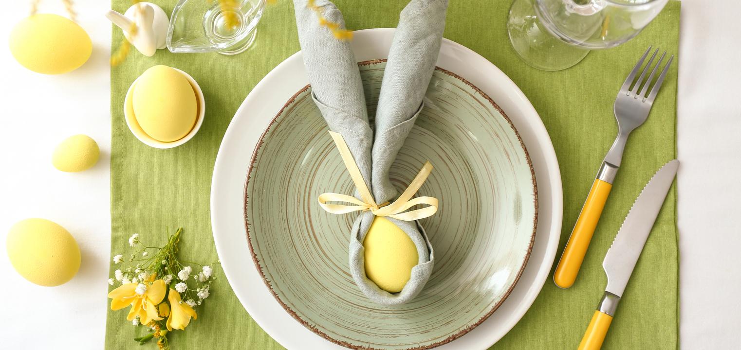W tej odsłonie proponujemy połączenie dwóch wiosennych, energetycznych barw – zieleni i żółci. Tak wystylizowany stół będzie przypominał o odrodzeniu życia i nadziei na lepszy czas. Nie może tu zabraknąć żółtej zastawy - najlepiej z elementami bieli, który nieco uspokoi ten żywy look. W ramach dekoracji postawcie na motyw kurcząt, które mogą ozdabiać każde z nakryć albo stanowić część większej dekoracji, umieszczonej na środku stołu – pięknie będzie wyglądać długie i wąskie naczynie wypełnione rzeżuchą, żółtymi pisankami oraz wspominanymi kurczakami. Dołóżcie zielone serwetki, bazie oraz przeźroczyste szklanki i karafki.