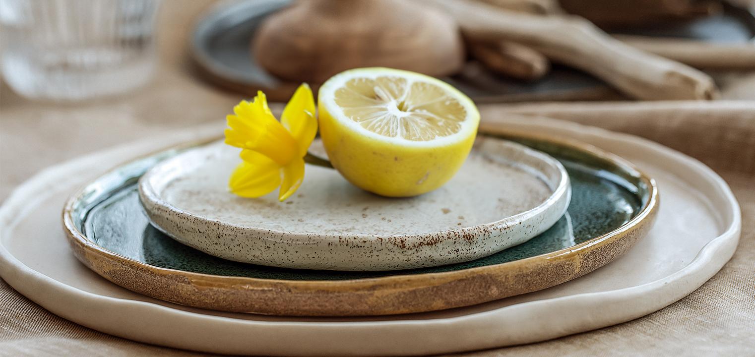 Tegorocznym trendem stają się również wyroby ceramiczne w nakrapiane wzory nawiązujące swoją prostotą do stylu zwanego „bauhaus" (jego geneza to Niemcy, rok 1919 r. charakteryzujący się funkcjonalnym, przemyślanym i zarazem estetycznym wzornictwem przemysłowym). Talerze, kubki, miski, patery i inne elementy zastawy będą świetnie łączyć się z surowym, drewnianym stołem. Do tego postawmy na dodatki w kolorze dominującym na ceramice. Świetnie sprawdzi się tutaj duży dzban na wodę lub misa na słodkości. Pozwólmy sobie również na przyjemność w postaci zapachowej świecy, ona zawsze ociepli atmosferę domowego ogniska, a świeże cytrusowe aromaty zmobilizują do działania wiosną.